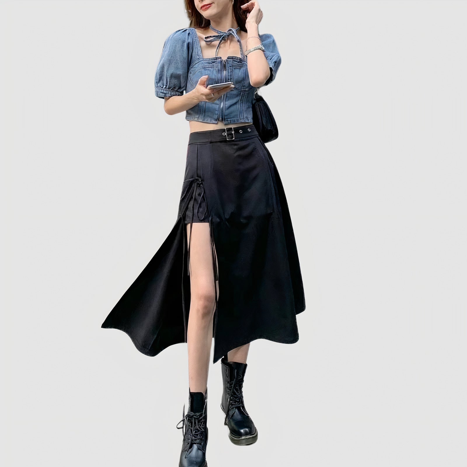 Las faldas góticas con aberturas son ideales para quienes desean añadir un toque de dramatismo a su estilo. Las aberturas, ya sean sutiles o audaces, añaden un elemento de sensualidad y misterio. Estas faldas, fabricadas con materiales como cuero ecológico, seda o tul, son perfectas para salidas nocturnas y fiestas temáticas. Las aberturas no solo añaden movimiento y ligereza, sino que también realzan tu silueta, creando un look atrevido y elegante.